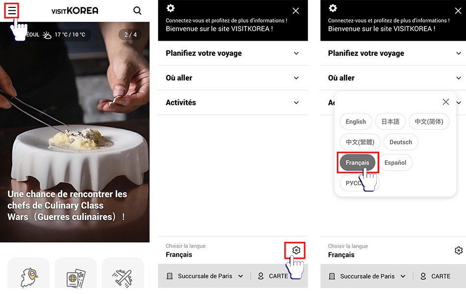 En novembre 2024, l'application mobile VISITKOREA a lancé un service de changement de langue permettant son utilisation en français. Téléchargez l'application, accédez dans le menu des paramètres et sélectionnez le français dans l'option de changement de langue. L'application restera en français même après un redémarrage.