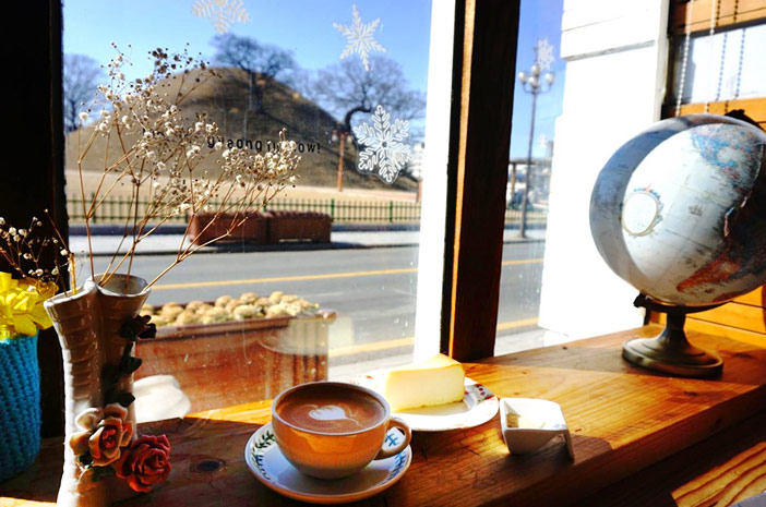 Crédits) Café où l’on peut apprécier la tombe de l’époque Silla via la fenêtre Tous les sites touristiques cités ci-dessous sont compris dans la zone des vestiges de Gyeongju, classée au patrimoine culturel de l’Unesco. Nous vous recommandons ainsi de vous rendre dans un café qui vous permet de prendre une pause en profitant des paysges de cet endroit historique.