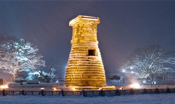 Crédits) Paysages nocturnes de l'observatoire Cheomseongdae (aut : ville de Gyeongju)L’observatoire Cheomseongdae, construit durant la 16ème année du règne de la reine Seondeok de l’époque Silla, est la construction en pierre la plus ancienne d’Orient. D’une hauteur de 9 mètres, l’observatoire Cheomseongdae a conservé sa forme initiale.