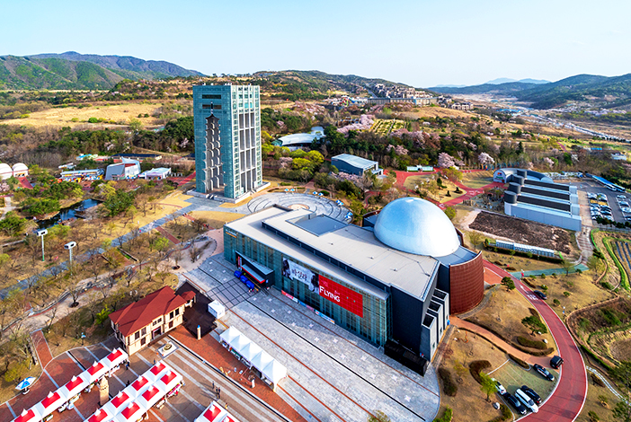Crédits) Parc de l'exposition culturelle et mondiale de Gyeongju Le parc de l'exposition culturelle et mondiale de Gyeongju, qui abrite la fameuse tour de Gyeongju, permet aux visiteurs de découvrir divers types d'installations artistiques et culturelles. Parmi elles, le parc met en avant les trois principales installations : '1 000 ans d'histoire, 1 000 ans dans le futur', 'Éblouissante lumière de Silla' et 'Étoile de Silla'. La première, '1 000 ans d'histoire, 1 000 ans dans le futur' nous fait voyager dans le temps : grâce à l'art médiatique, on remonte le temps jusqu'à Seorabeol, nom ancien de la ville de Gyeongju il y a 1 300 ans. On peut profiter de cet art au sommet de la tour Gyeongju dont la forme est inspirée de la pagode à neuf étages du site du temple Hwangnyongsa, la plus ancienne pagode en bois érigée sous le règne de la reine Seondeok et qui malheureusement n'existe plus aujourd'hui. De plus, on peut visiter le musée d'art Solgeo, le centre d'exposition situé dans ce parc.