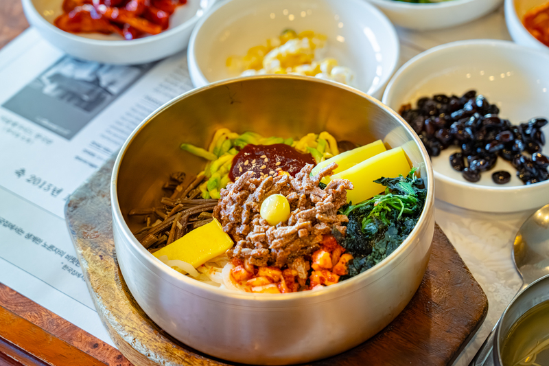 Un bol de riz agrémenté de fougères comestibles, d'épinards, de campanules, et d'autres ingrédients, est garni de viande sautée. Vous apprécierez les couleurs et la variété des arômes développés par ces ingrédients locaux de saison. Ce plat coréen emblématique illustre le style unique de la cuisine coréenne qui consiste à mélanger et à agrémenter différents ingrédients. Le bibimbap est considéré par le public international comme l'un de leurs plats coréens favoris.